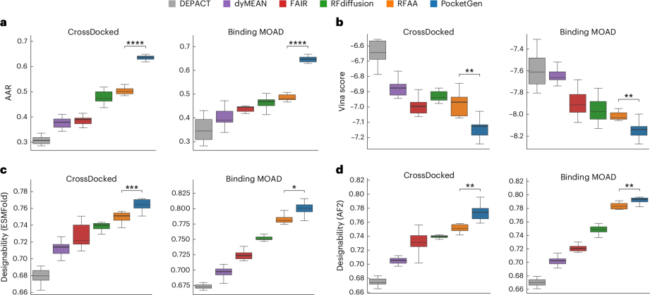 研究团队在CrossDocked和Binding MOAD两个数据集上对PocketGen进行了测试。CrossDocked数据集由通过交叉对接生成的蛋白–配体对组成,按30%的序列相似性划分为训练集、验证集和测试集。Binding MOAD数据集包括实验测定的蛋白–配体复合物,并根据酶编号进行划分。实验中,蛋白口袋定义为距离配体结合原子3.5 Å范围内的残基,平均每个口袋包含约8个残基,同时探讨了半径扩展到5.5 Å的设计能力(图3c)。