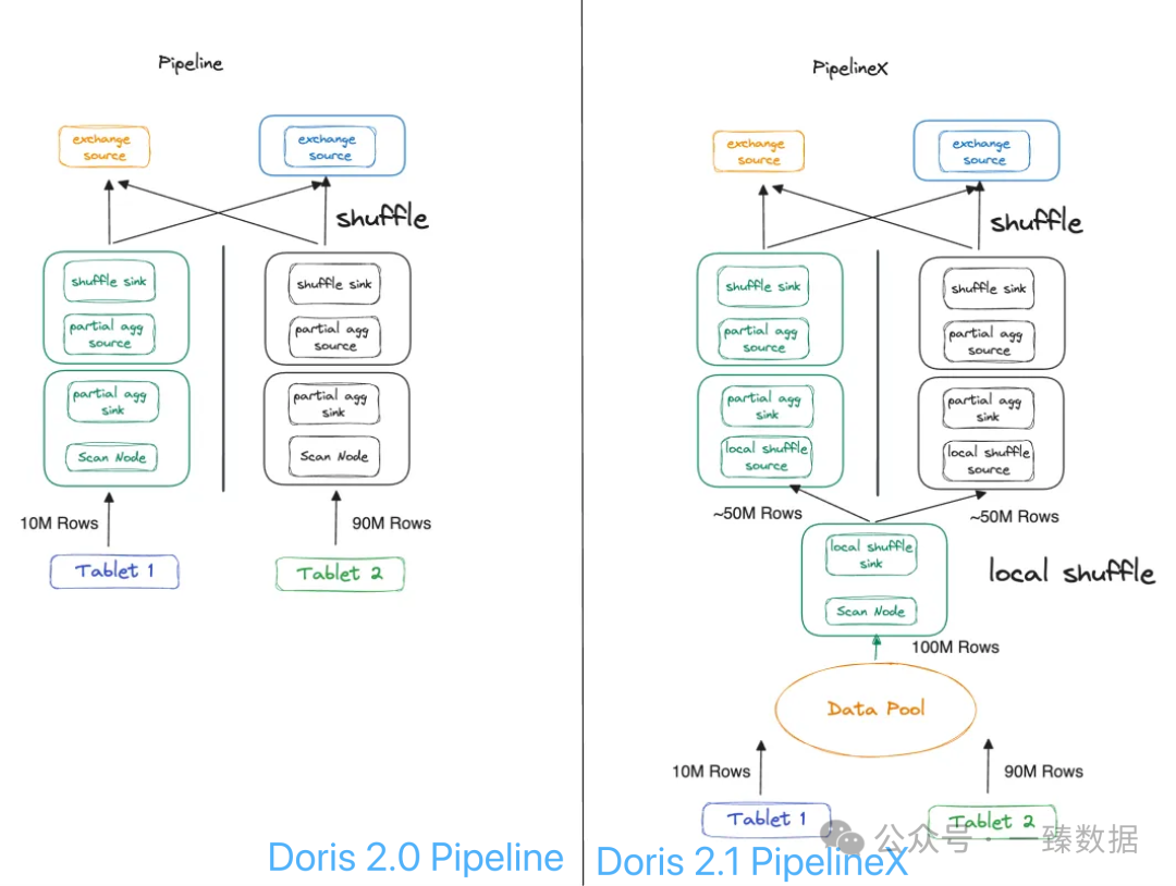 set enable_local_shuffle = true;最让人惊喜的是Doris 2.1版本后PipelineX的登场。它不仅解决了数据分布不均的问题,还像个精明的资源管家,通过共享状态复用,省下了不少重复初始化的开销。