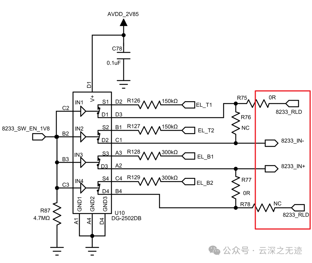 手表顶部的两个电极连接到 IN− 引脚和 RLD 引脚,而手表底部的两个电极短接在一起(在此测量处于活动状态时暂时)并连接到 IN+ 输入。