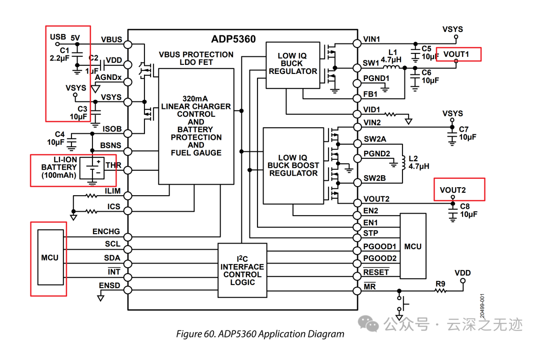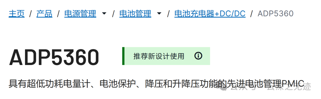 ADP5360 将一个用于单一锂离子(Li-Ion)/锂聚合物(Li-Poly)电池充电的高性能线性充电器与一个可编程的超低静态电流电量计和电池保护电路、一个超低静态降压、一个升降压开关稳压器以及一个监控电路组合在一起,可用于监控输出电压。