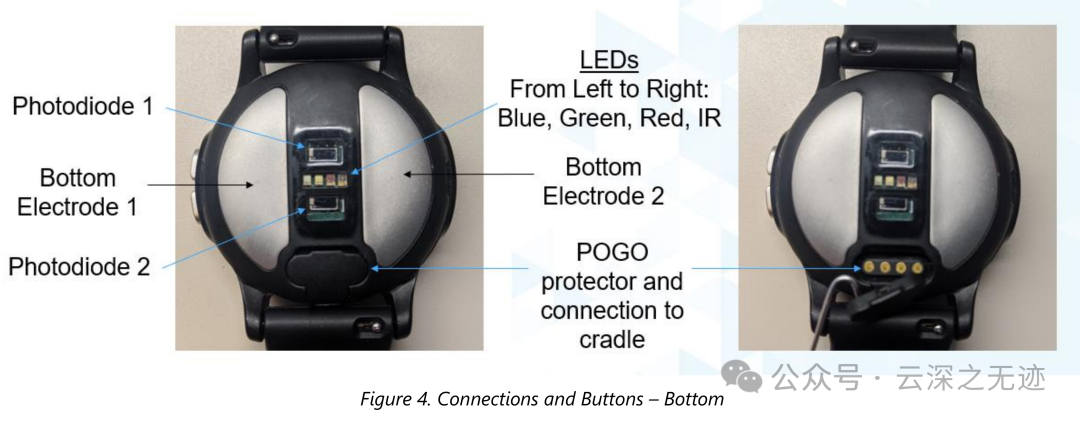 皮肤温度测量基于热敏电阻 (NTCG104EF104FTDSX)。用于皮肤温度测量的热敏电阻热耦合到手表的底部。