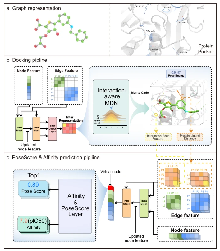 近年来,深度学习模型在蛋白质-配体对接和亲和力预测中的应用引起了越来越多的关注,这种应用对于基于结构的药物设计至关重要。然而,许多这些模型忽略了复合物中配体和蛋白质原子之间相互作用的复杂建模,从而限制了它们的泛化和可解释性的能力。