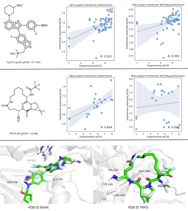 LSD1是一个潜在的癌症治疗靶点。作者开发了两个小分子系列,产生了54种化合物。最强的亲和力为0.7nM,如图3所示,化合物Cpd 27 pg 64随后在口服和静脉注射小鼠试验中进行了代谢稳定性评估。作者还针对治疗SARS-CoV-2病毒的药物进行了研发,该病毒的一个关键靶点是主蛋白酶(Mpro)。作者采用了对小分子进行大环修饰的策略,设计了9个小分子。其中最有效的亲和力为16 nM,如图3所示。在亲和力预测任务中,LSD1和Mpro项目中Interformer实际pIC50值与预测pIC50值的相关系数分别为0.523和0.604,相比之下,只训练晶体结构、而未加入位姿的负采样评分的亲和预测模型,其pIC50的相关性仅为0.330和0.097。这些现实世界的制药场景强调,当实际的对接姿势可能不精确时,仅对晶体结构进行训练的模型表现欠佳。