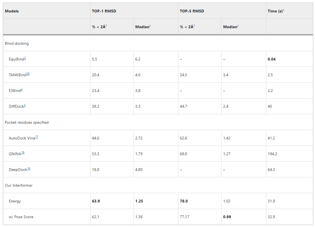 作者将Interformer与一些具有代表性的方法进行了比较,在PDBBind测试集上,确定RMSD小于2Å的对接姿势的成功率(越高越好),以及RMSD的中位数(越低越好)。作者研究了对接的两种主要场景:第一种是提供整个蛋白质结构作为输入,称为“盲对接”,第二种是基于已知的参考配体,称为“指定的口袋残基”。结果如表1所示,作者提出的方法显著优于以往的所有方法,在两种场景下的前1名成功率为63.9%,显著高于其他方法。加上位姿得分模型,前1名的成功率下降到62.1%。尽管RMSD似乎降低了,但所选择的姿势往往表现出更准确的特定相互作用。与基于指定的口袋残基方法相比,Interformer耗时也更短。