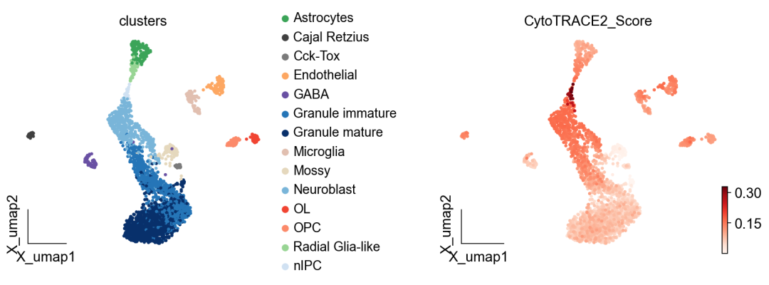 对于拟时序分析而言,确定发育的起点是至关重要的,因此我们在OmicVerse中整合了CytoTrace2来预测单细胞数据中每个细胞的分化潜能。