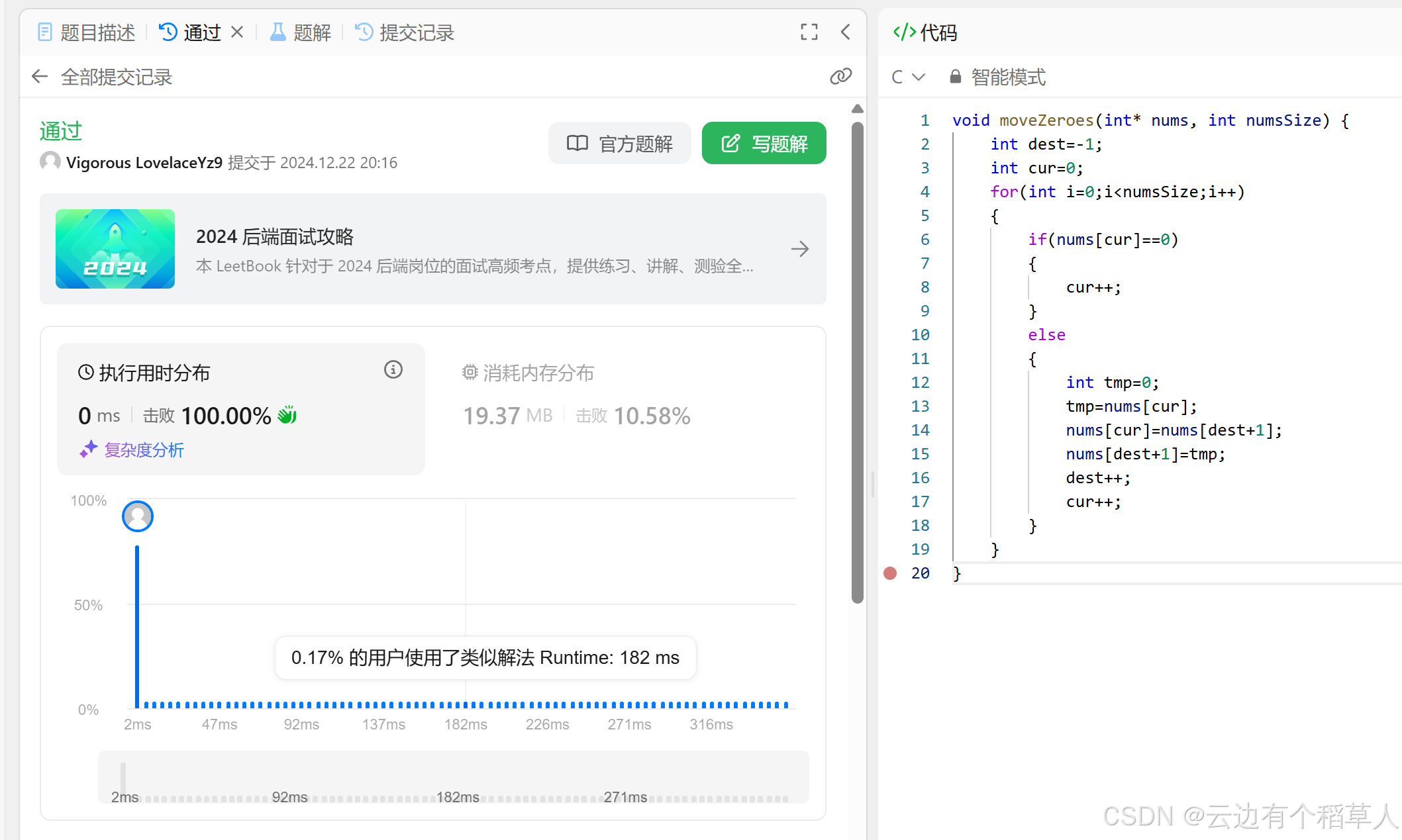 下面第一个是我自己根据算法原理写出来的代码,一开始感觉自己写的还行也能通过,再下面第二个就是最优解,才几行代码就实现了,一对比,简直太牛了!确实给菜鸡的我一点小小的震撼,在下佩服。