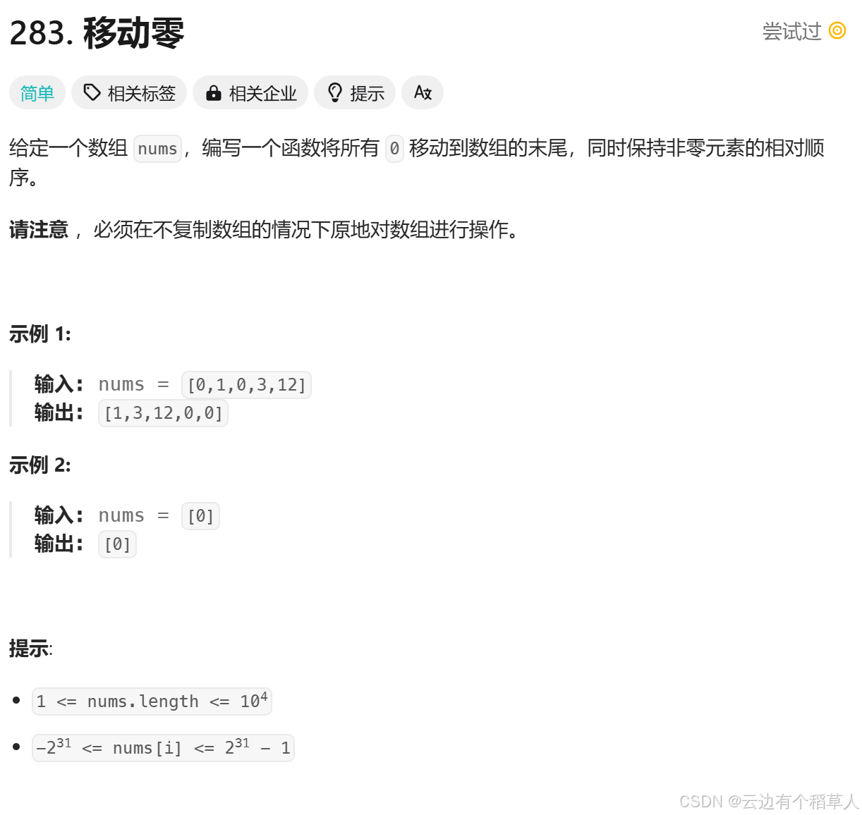 题目比较容易理解,但注意一点,必须在不复制数组的情况下原地对数组进行操作。