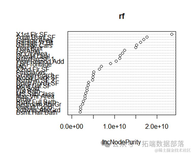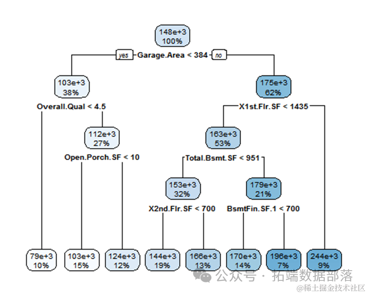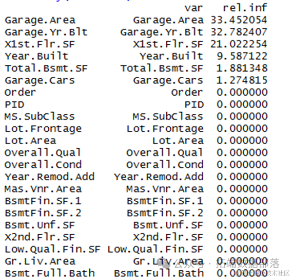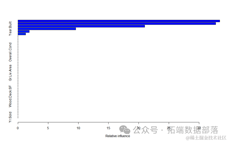 从模型结果来看,可以得到和决策树随机森林类似的结果。上面是相对重要性变量的图,可以看到建立年份,车库面积,房屋层高对房屋的价格有重要的影响
