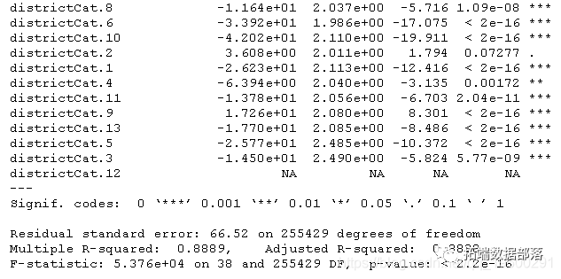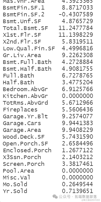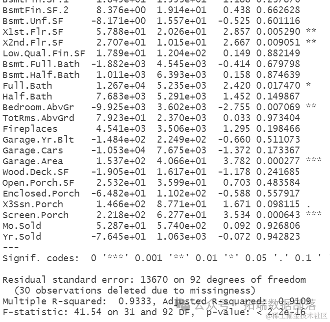 从回归模型的结果来看,我们可以看到部分变量是显著的,说明他们对房屋的价格,有很大的影响。显著的变量有车库面积,走廊,浴池,总体质量,房屋层高等等。从R方的结果来看,R方等于93%,因此,模型解释了房屋价格大部分的方差,可以说模型的拟合效果非常良好