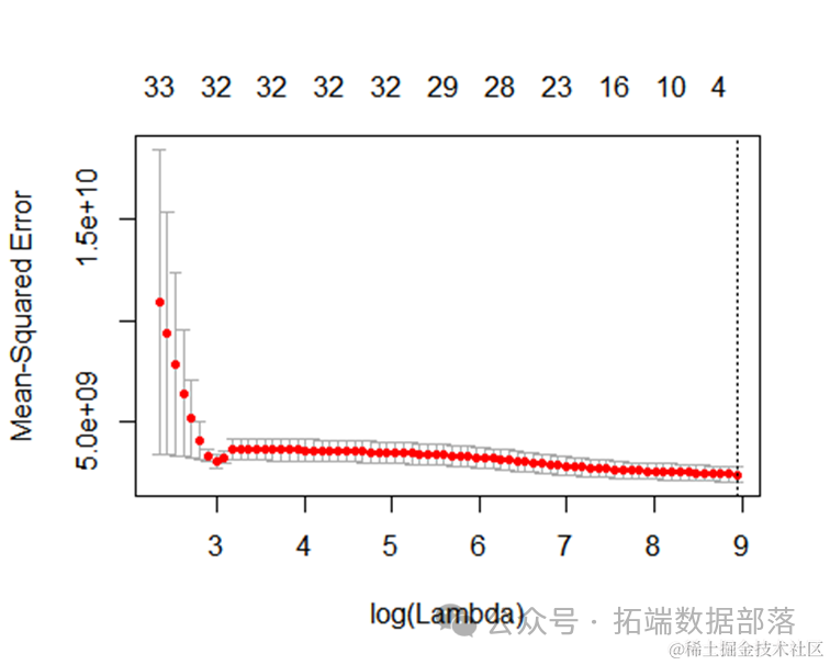 LASSO回归复杂度调整的程度由参数λ来控制,λ越大对变量较多的线性模型的惩罚力度就越大,从而最终获得一个变量较少的模型。因此误差最小的点对应选取log(lamda)=9为最优模型。