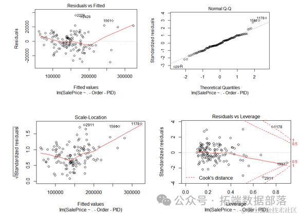 左上方的图是一个散点图,用于表示拟合值和残差的关系。从图中可以看到,除了第二个异常值外,其余所有点都在纵坐标值-1和+1之间随机分布。