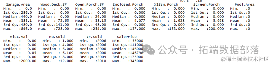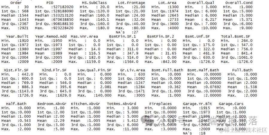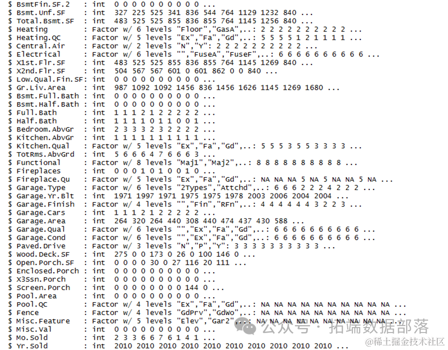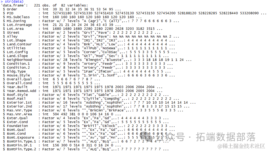 通过查看数据结构,我们可以了解到,哪些数据是数值变量比如房屋面积,总体质量建立年份,哪些数据是因此变量比如街道,土地坡度,房屋状况,哪些数据的因子有哪些。
