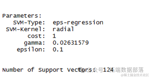 从结果来看,可以得到它的最优参数以及支持向量的个数124个。在得到模型结果后,对测试集进行预测,并且得到误差结果。