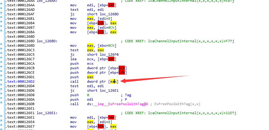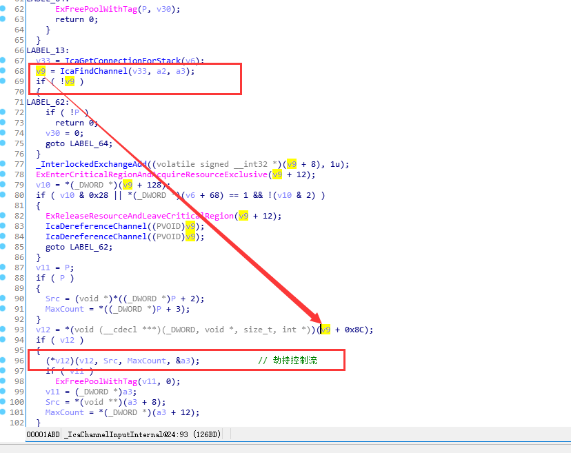 8e6539a0 90239354 890a0670 00000005 0000001f termdd!IcaChannelInputInternal+0x3a7 (FPO: [Non-Fpo])发现IcaChannelInputInternal有虚函数调用,可以从这劫持控制流