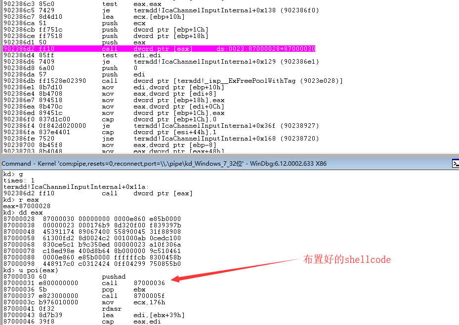 现在exp的一般的做法是内核堆喷射,在Non-paged Pool进行堆喷,win7在这个地址上面是没有DEP的,所以直接喷内核shellcode就好了,而且win7的Non-paged Pool的起始地址比较固定,那还好命中一些