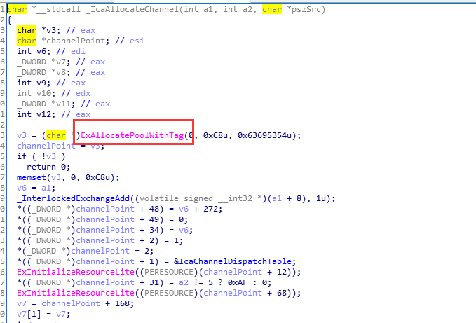 第一个调用栈,可以看到从NtCreateFile到termdd!IcaDispatch再到termdd!IcaCreateChannel,就是系统创建的这个channel,分配这个channel后进行了_IcaBindChannel操作