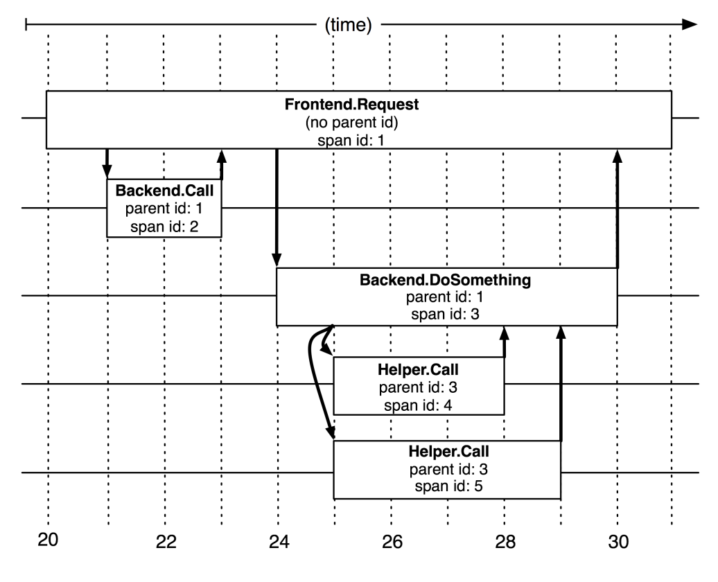 每一次Trace是由若干个有顺序、有层级关系的Span组成的一棵追踪树结构,图片来源Dapper论文