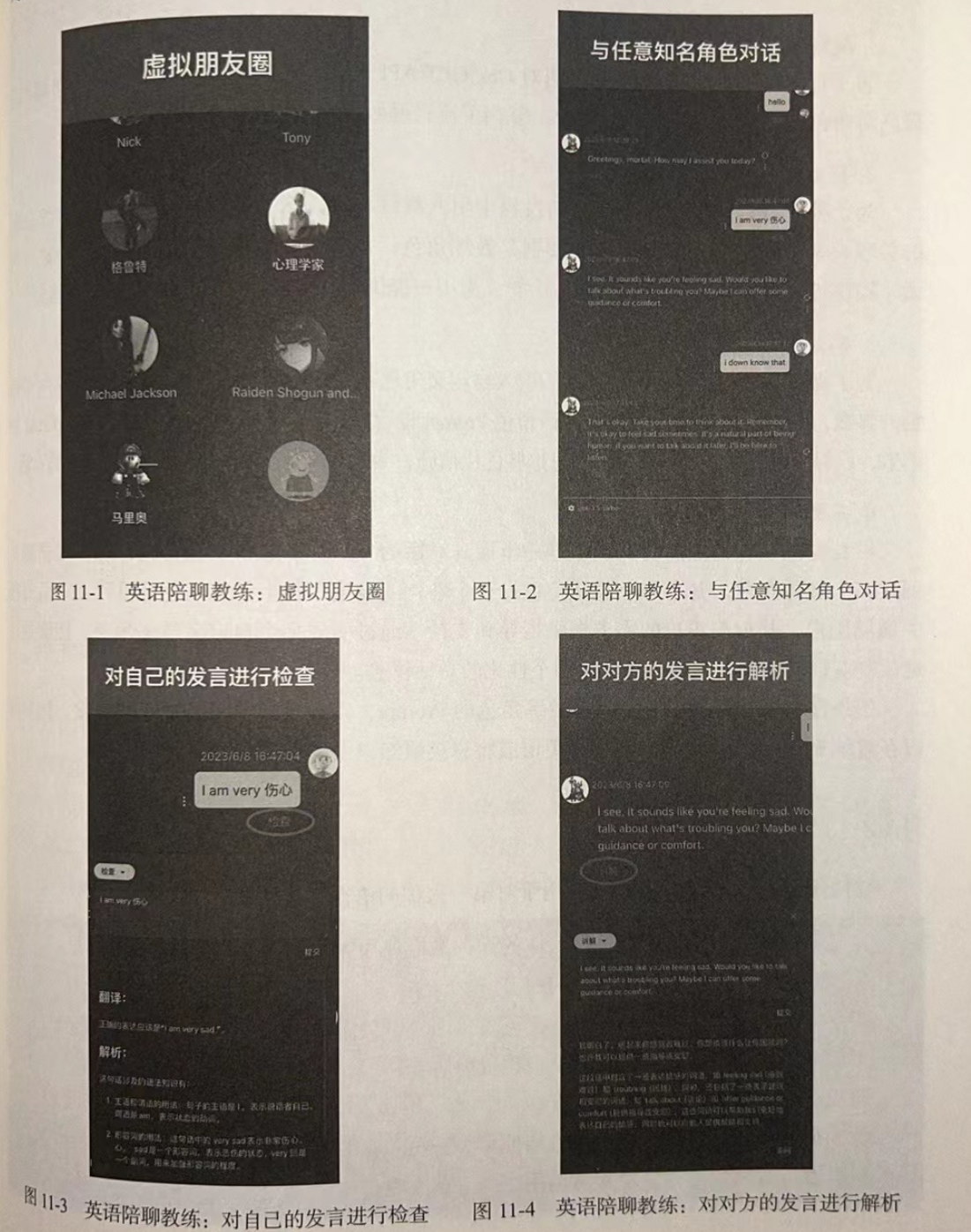 英语陪聊教练是一个基于 GPT-3.5 引擎的“角色聊天 + 语言学习”工具。开发团队希望创造一个人人可用的无阻碍英语交流环境。接下来,我们将分享该项目的主要功能及实现过程。图 11-1 至图 11-4 分别展示了英语陪聊教练产品的虚拟朋友圈、与任意知名角色对话时检查自己的发言,以及对对方的发言进行解析的效果。