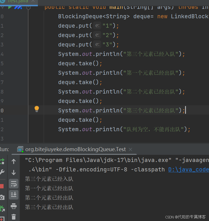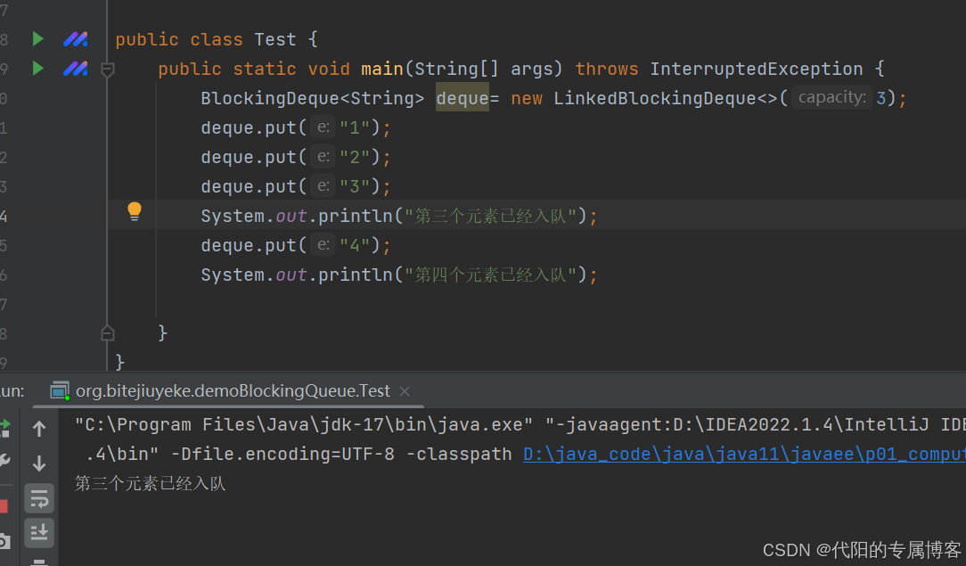 – 这里设置一个三个大小的阻塞队列,当第四个元素入队时候就会发生阻塞等待