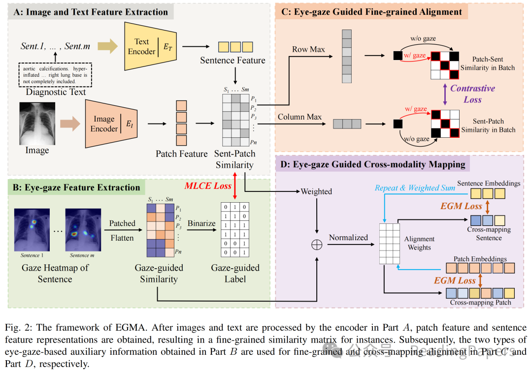 如图2所示,作者提出的方法框架由四个主要部分组成。首先,在部分A中,作者从图像和文本中提取特征,以获得精炼的实例级别相似度矩阵。其次,在部分B中,作者整合了从放射科医生的音频、图像和眼动数据中提取的文本转录,以可视化和映射放射科医生在诊断期间对图像特定区域的关注。这一过程建立了文本和图像之间的对齐,促进了模型训练。详细的眼动数据处理方法在第III-A节中描述。由于眼动数据紧密连接了文本和局部视觉信息,在从部分B获取辅助信息后,作者引入了眼动引导的精炼对齐训练策略,如图2的C和D部分所示。具体而言,作者在第III-B节中介绍了眼动引导的细粒度文本-图像相似度矩阵的优化算法。最后,在第III-C节中,作者提出了眼动引导的跨模态映射算法。