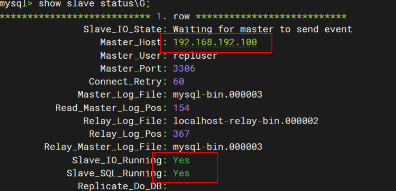 使用以下命令查看从服务器的状态,以确保复制正常运行: