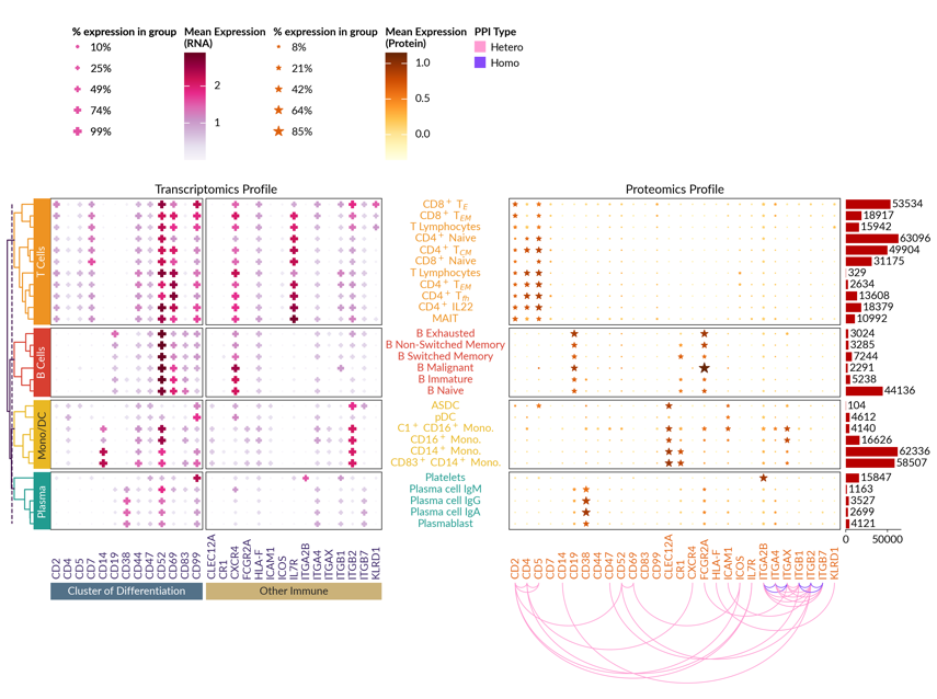 使用来自 COVID-19 患者的多组学数据(包含蛋白组学和转录组学信息),研究团队创建了由两个跨布局拼接而成的热图,对两种组学特征进行并列比较,并叠加细胞元簇、细胞丰度和基因表达等信息。