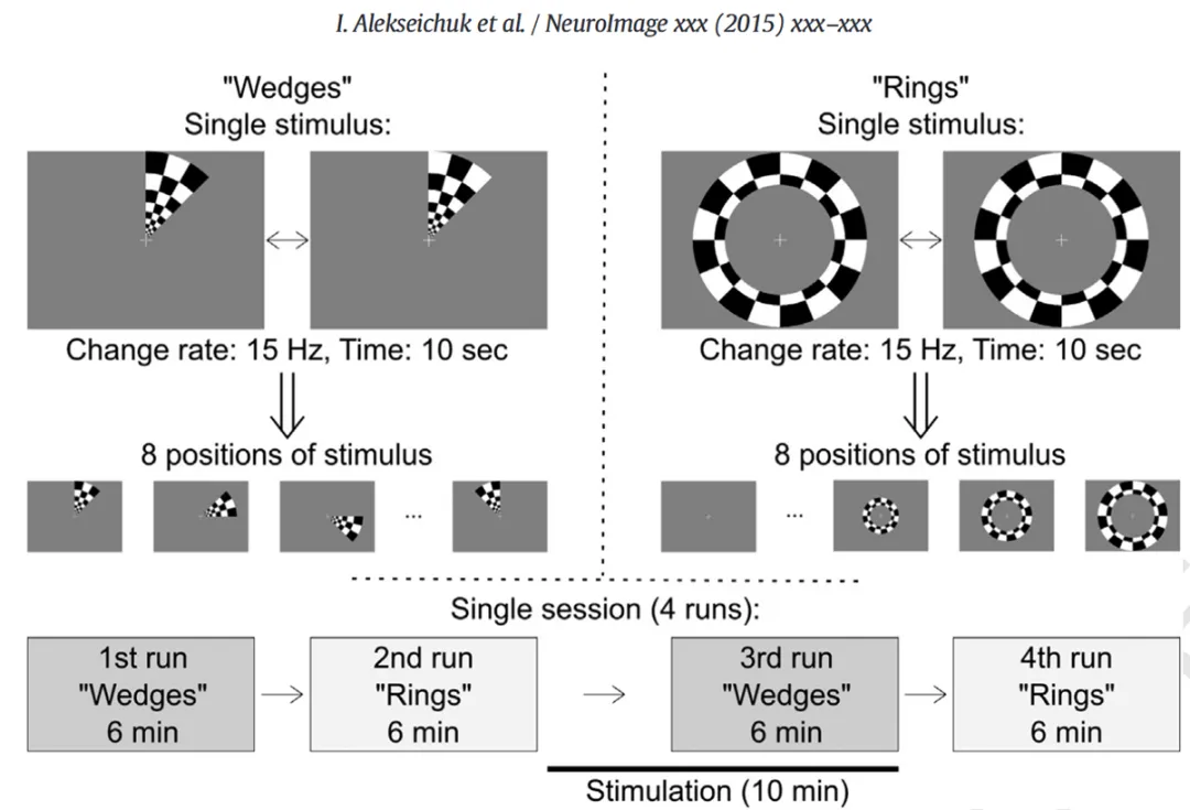 16名健康成年志愿者报名参加本研究。刺激电极(OZ 、CZ)直流电刺激电流1mA。交流电刺激电流峰峰值2mA,频率10Hz。刺激时间10min。此外,控制组实验中,还使用了另一种交流电刺激布置,电极位置为C5–C6,聚焦电场于中央-额叶区域。Run 3 vs Run 1 评估在线效应Run 2 vs Run 4 评估离线效应。