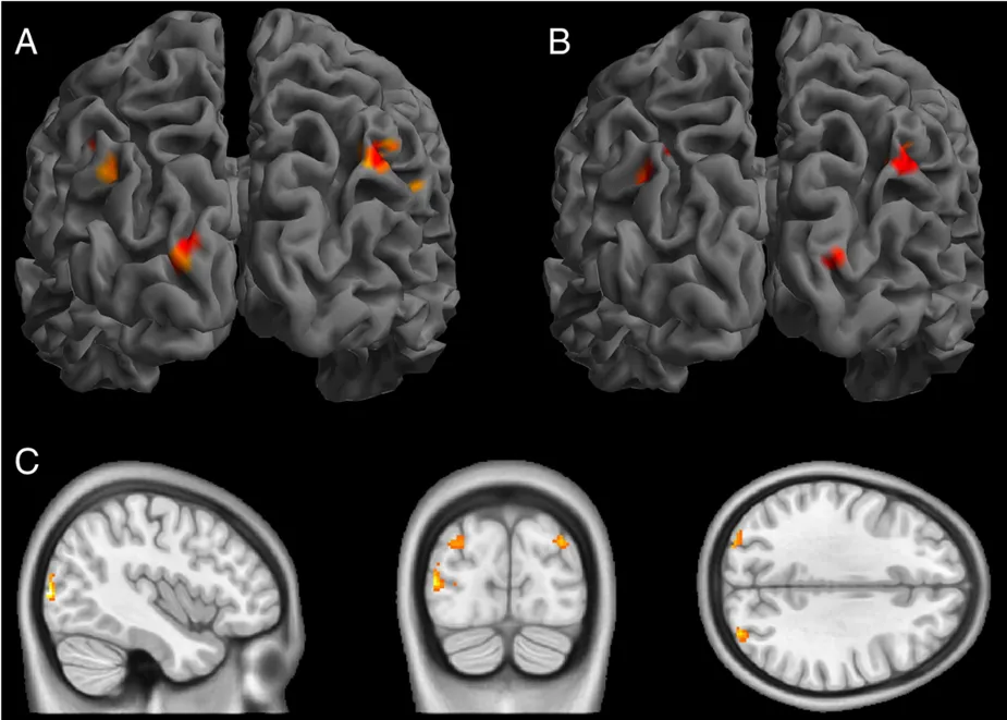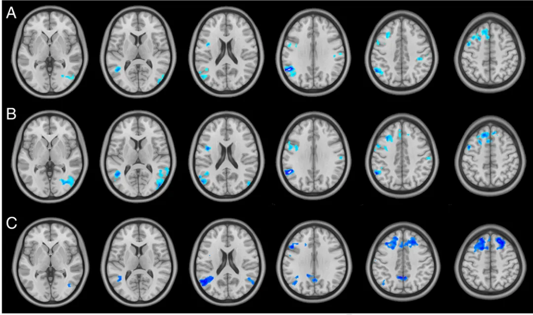 在线效应:与经颅直流电刺激(tDCS)不同,tACS 没有在刺激期间(即“在线”效应)对皮层产生显著影响。无论刺激是施加在枕叶皮层还是中央-额区,都未观察到显著的即时皮层活动变化。即时后效(aftereffect):尽管tACS在在线效应上没有表现出显著影响,但即时后效却显现出了显著的BOLD信号下降。对于施加在枕叶皮层的tACS刺激,BOLD信号下降在视觉相关区域(如下枕回和中枕回)以及一些远距离区域都得到了体现。而对于中央-额区的tACS刺激,在枕叶区域并未观察到任何显著效应。与假刺激的比较:通过将tACS在枕叶皮层的后效与假刺激的后效进行比较确认了tACS引起的BOLD信号变化的方向和空间定位:枕叶以及顶-额区域的BOLD信号出现显著下降。