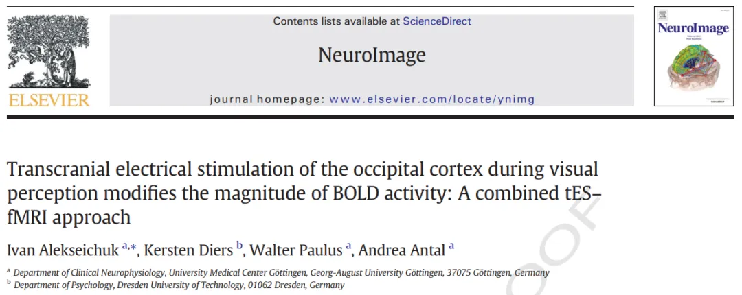 本研究的目的是探讨视觉皮层中的血氧水平依赖(BOLD)信号变化,是否可以作为反映经颅电刺激(tES)在线和离线效应的生物标志物。研究采用阳极经颅直流电刺激(tDCS)和10 Hz经颅交流电刺激(tACS),刺激时间为10分钟,刺激部位为健康成年人枕叶皮层,在呈现不同视觉刺激时进行。研究设计为交叉、双盲实验。同时,也进行了控制实验,使用了假刺激以及另一种电极布置。