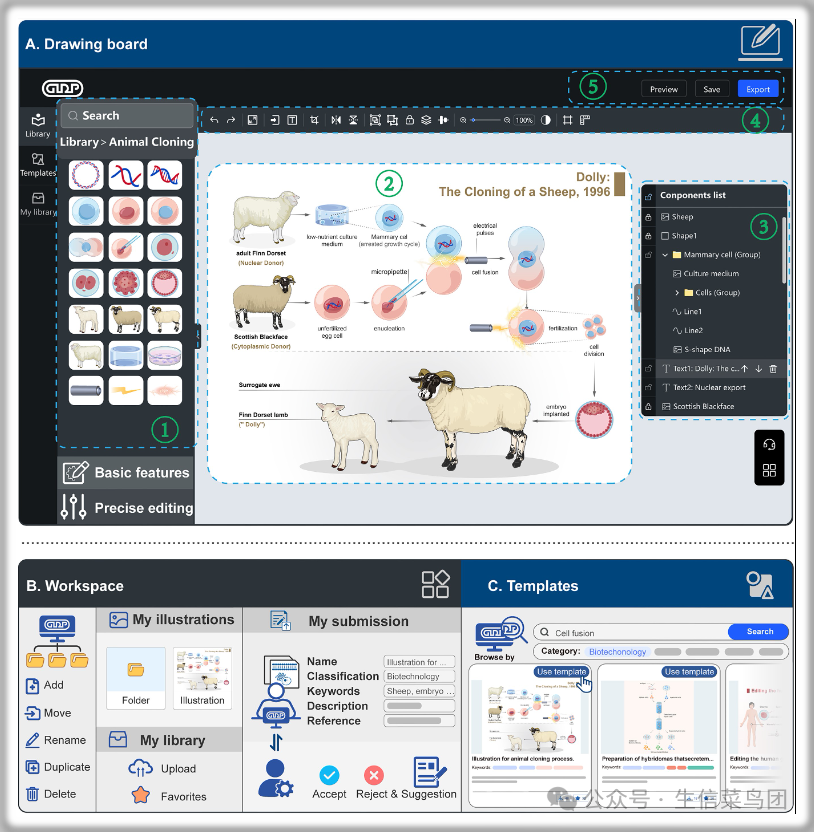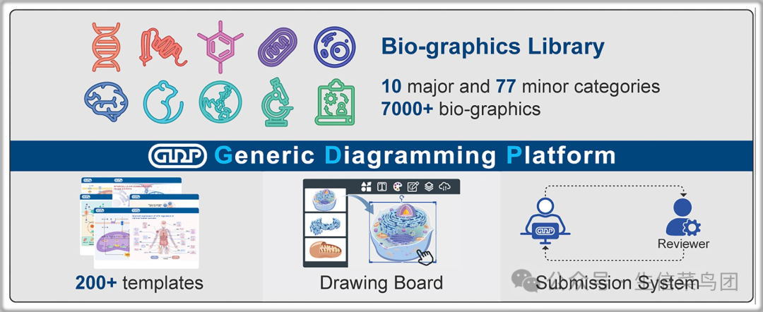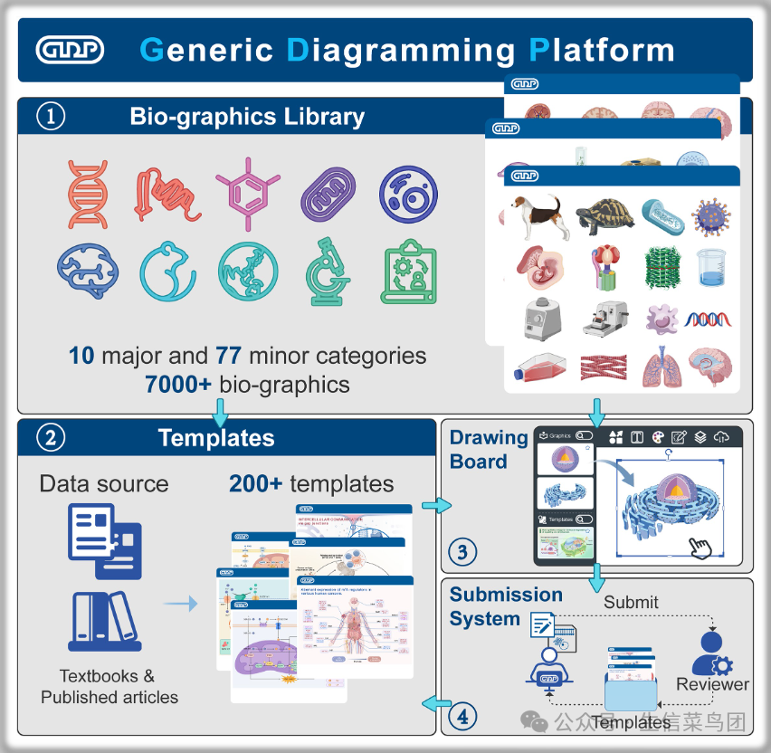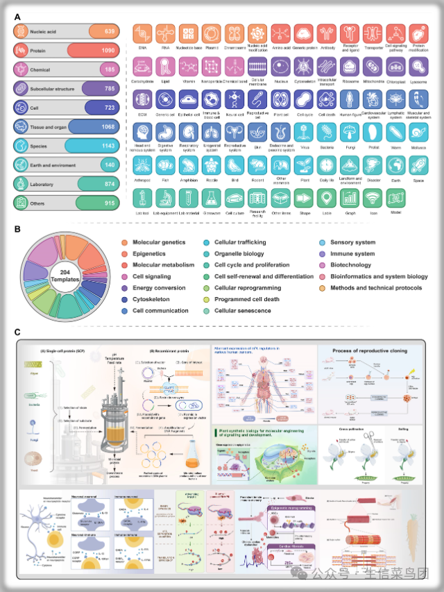 图2. GDP生物图形库和模板的分类与统计。(A)生物图形库被分为10个主要类别和77个次要类别。条形图(左侧)显示了每个主要类别中的生物图形数量,而矩阵(右侧)展示了每个主要类别中的子类别。(B)饼图说明了模板在不同类别中的分布情况。(C)一些模板库的代表性示例。