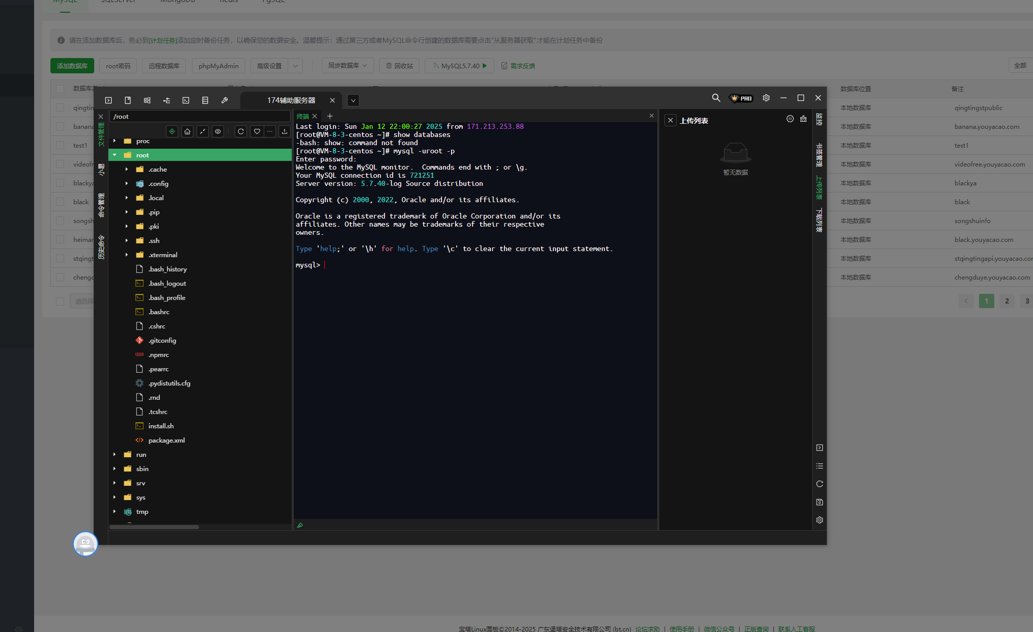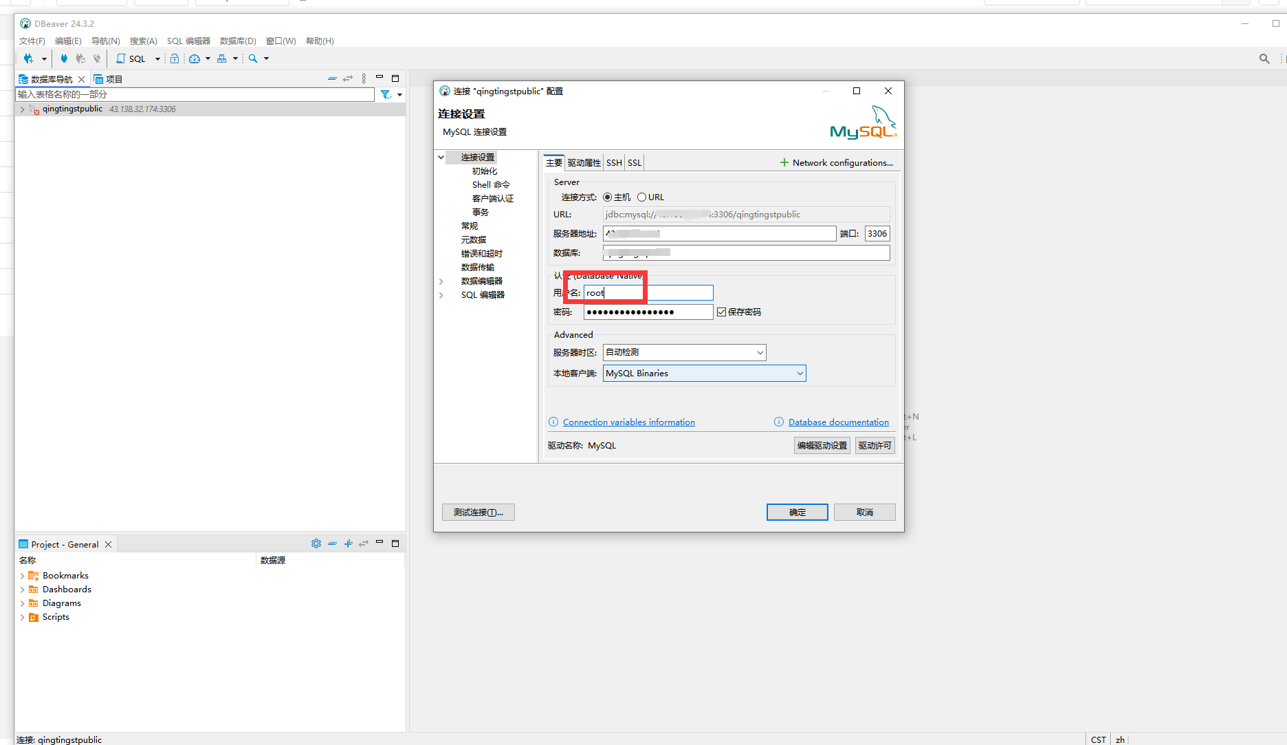 考虑是否是这个数据库用户名 权限不够,因此我改为root再次链接,发现—还是不行,那么我们现在只能去登录服务器试试了。
