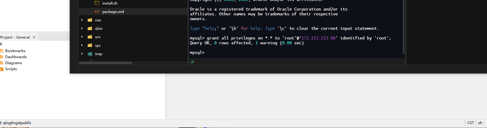 grant all privileges on *.* to 'root'@'171.213.253.88' identified by 'root';