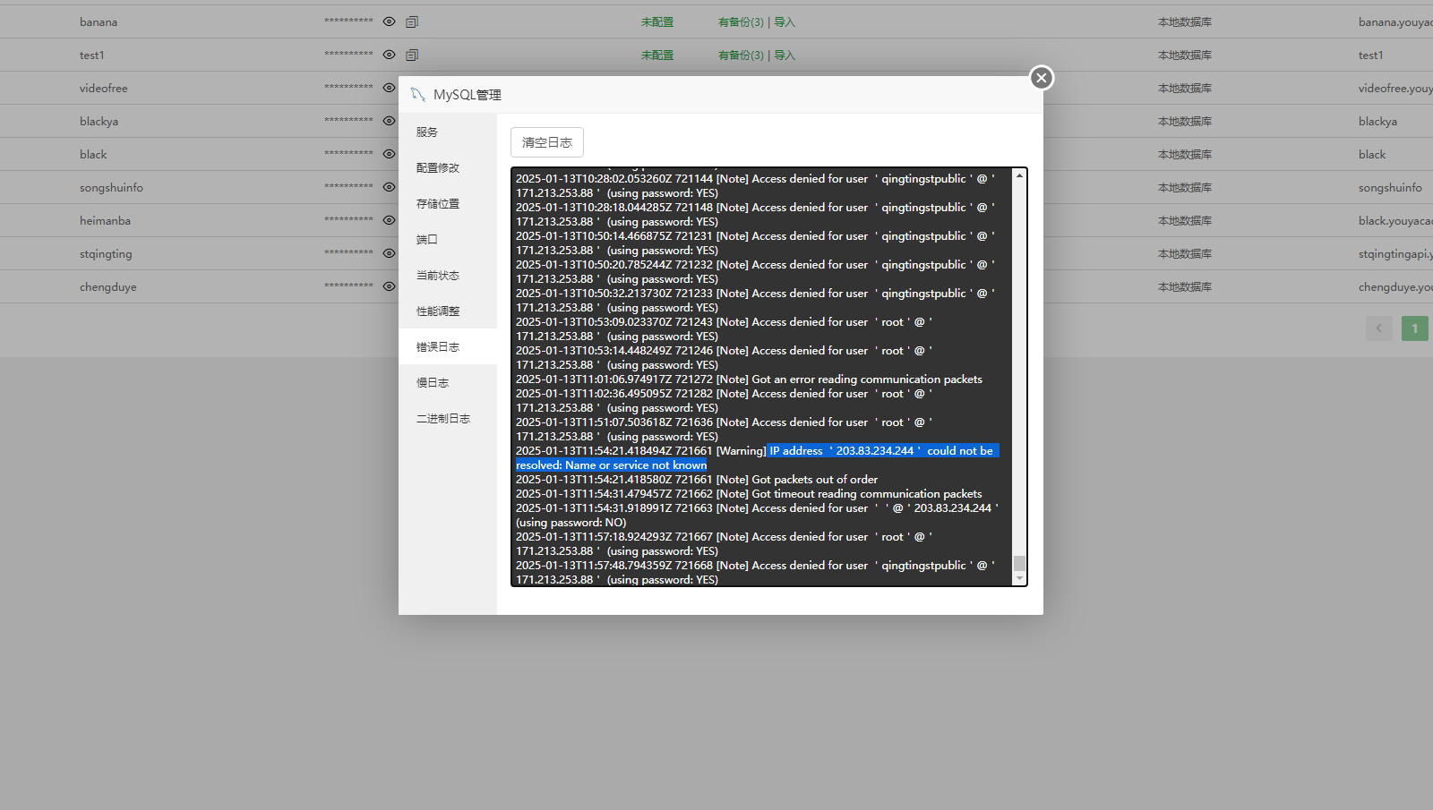查看了日志 IP address '203.83.234.244' could not be resolved: Name or service not known 就是ip被拒接