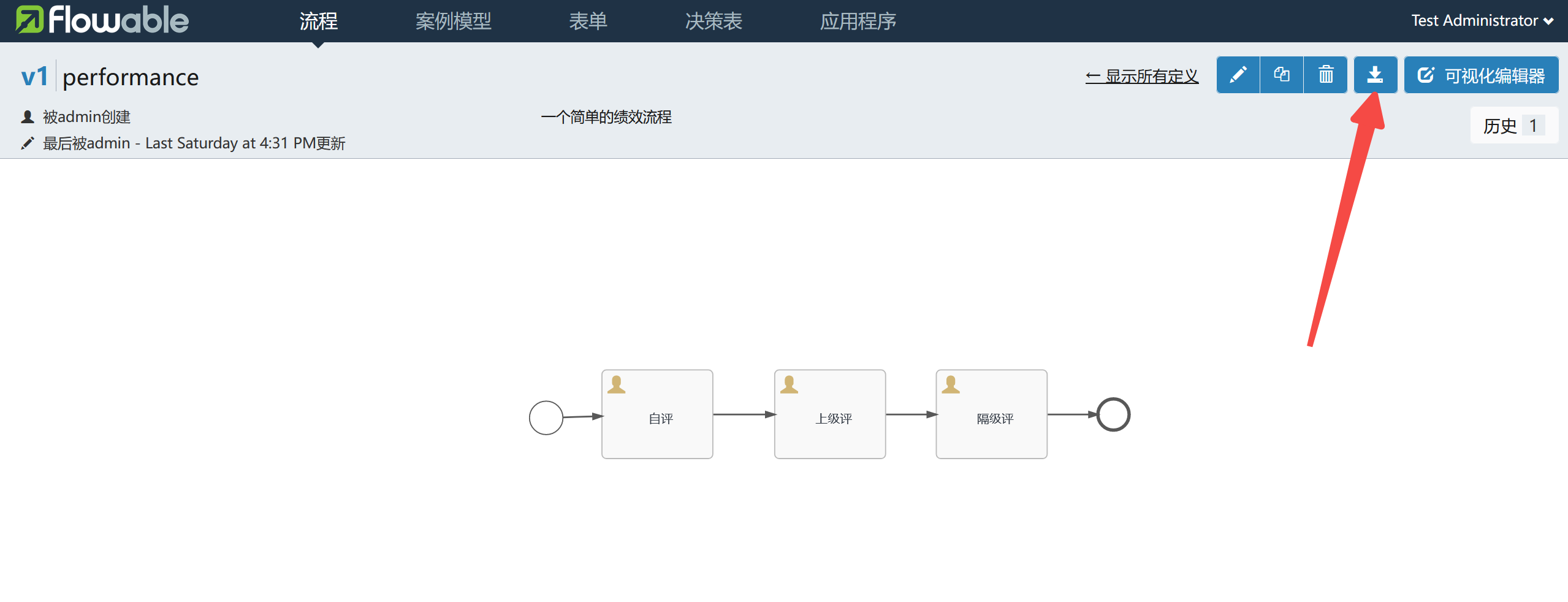 本次我们演示使用的模型就是上篇中在Flowable-UI中建立的绩效模型,因此我们需要把模型文件导出。在模型管理界面,我们绘制的模型在详情页都有导出选项。