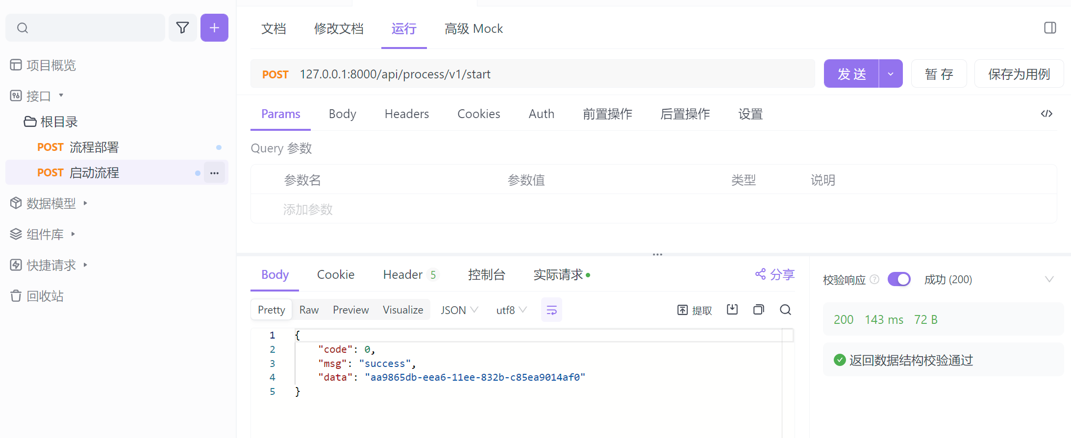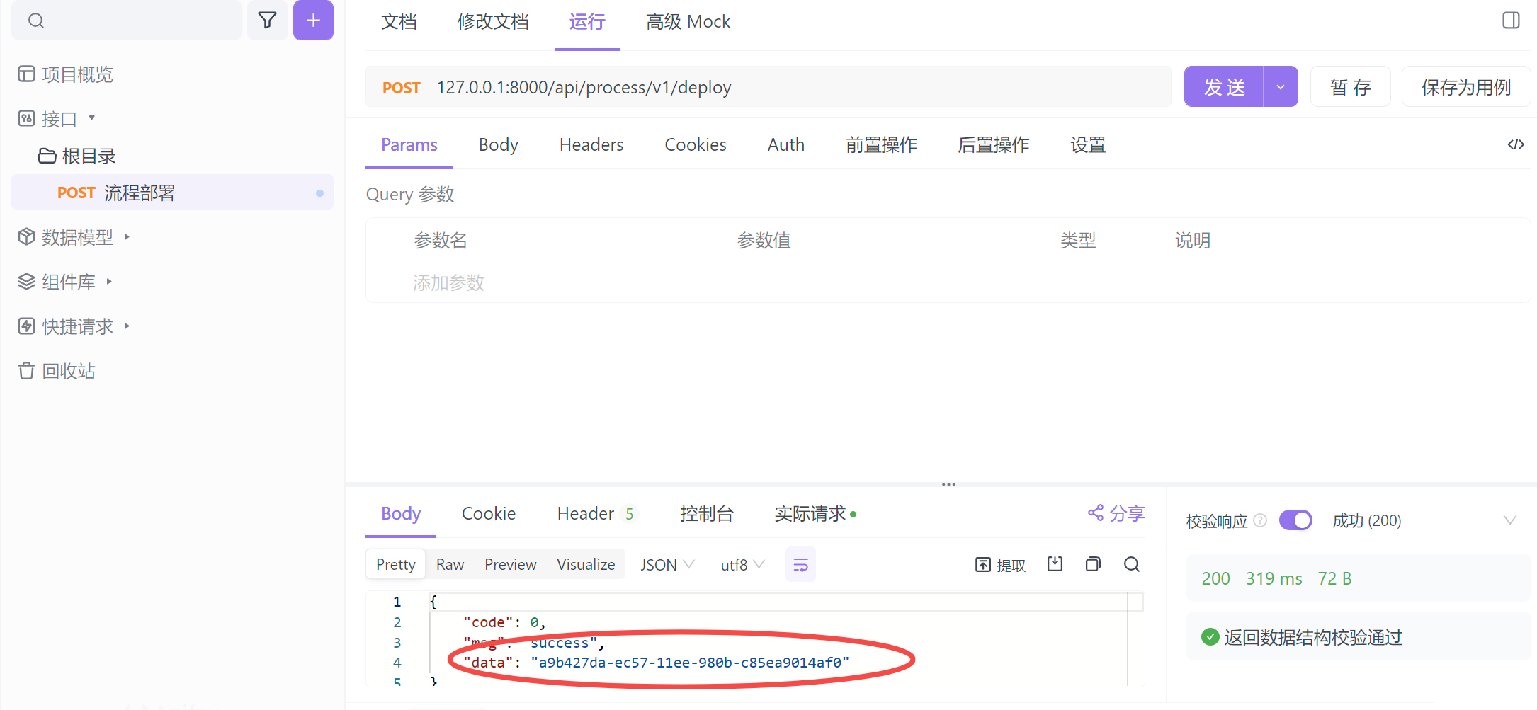 }完成编码通过调试工具调这个接口,当方法正常执行后,会返回流程部署的id。