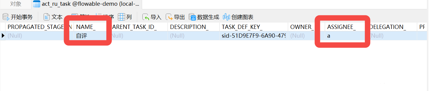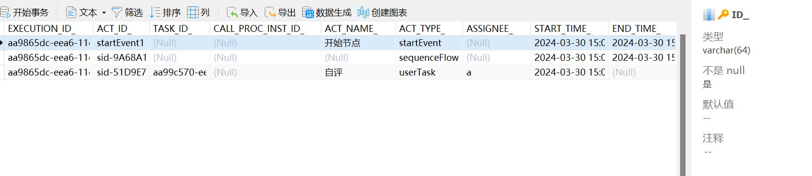 启动流程也需要我们关注三张表,此时我们可以在act_ru_task表中看到当前流程走到了自评节点以及节点的承办人,即当前待办的记录信息。