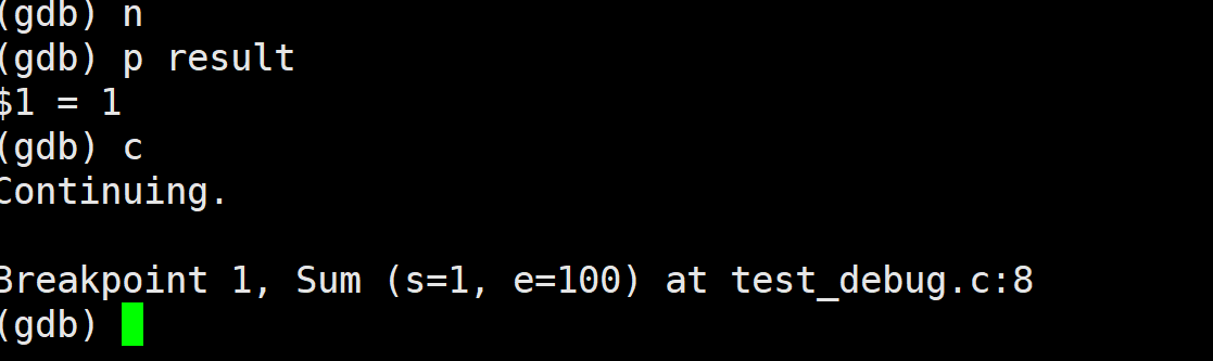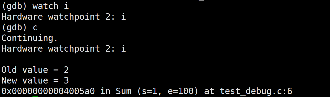 (gdb) watch result程序运行时,变量 result 发生任何变化都会触发暂停。