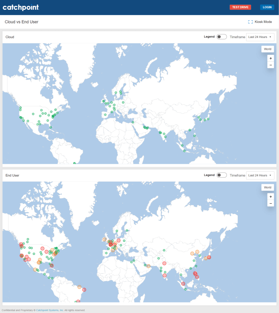 云端显示全绿,表明第一公里性能接近完美。下面的地图显示了从最终用户角度看到的现实;红色和黄色标记代表云端监控看不到的性能问题。