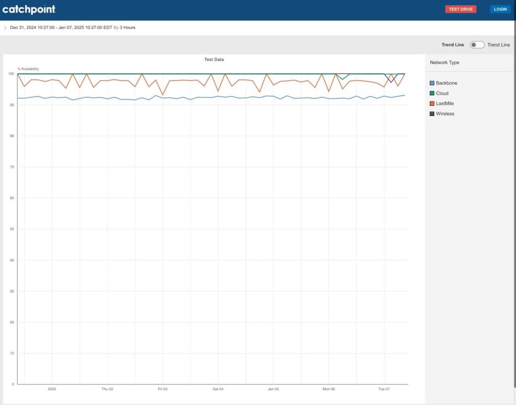 现在,将其与骨干网(蓝线)、最后一公里(红线)和无线(紫线)数据进行比较。这些波动突显了用户每天面临的挑战,从区域ISP中断到最后一公里的不稳定性。要点是什么?虽然云监控数据可以让仪表盘看起来不错,但它并没有考虑到用户连接的真实网络环境。要真正了解可用性,您需要监控所有这些网络类型。