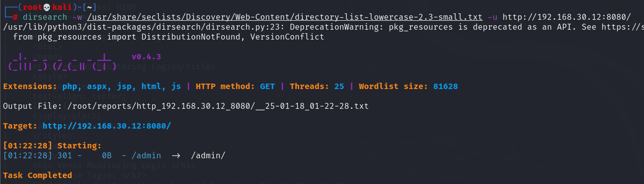 dirsearch -w /usr/share/seclists/Discovery/Web-Content/directory-list-lowercase-2.3-small.txt -u http://192.168.30.12:8080/