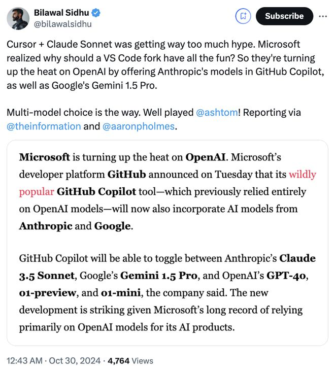 随着新模型的加入,GitHub Copilot 肯定会赢回一批用户。毕竟很多程序员都转到 Cursor 了,因为那里可以使用 Claude-3.5-Sonnet。