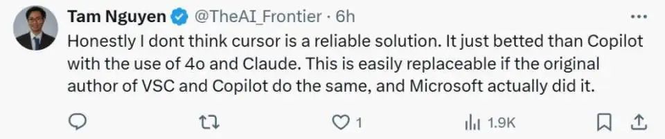 还有网友表示:「老实说,我不认为 Cursor 是一个可靠的解决方案。它只是在使用 4o 和 Claude 方面比 Copilot 更胜一筹。如果 Copilot 也这么做,这很容易被取代,而微软确实这么做了。」