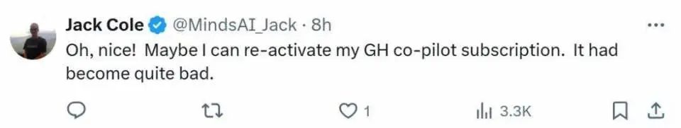 貌似大家还是习惯GitHub Copilot,「太好了!也许我可以重新激活我的 GitHub Copilot 订阅。」