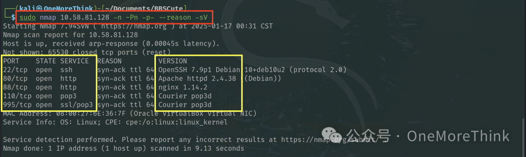 对靶机进行全端口扫描、服务扫描、版本扫描,发现22/SSH、80/HTTP、88/HTTP、110/POP3、995/POP3。