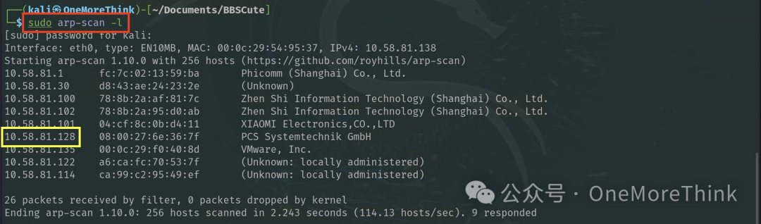靶机启动后,没有提供IP地址。由于Kali和靶机在同一个C段,可以扫描ARP协议获取靶机IP地址。