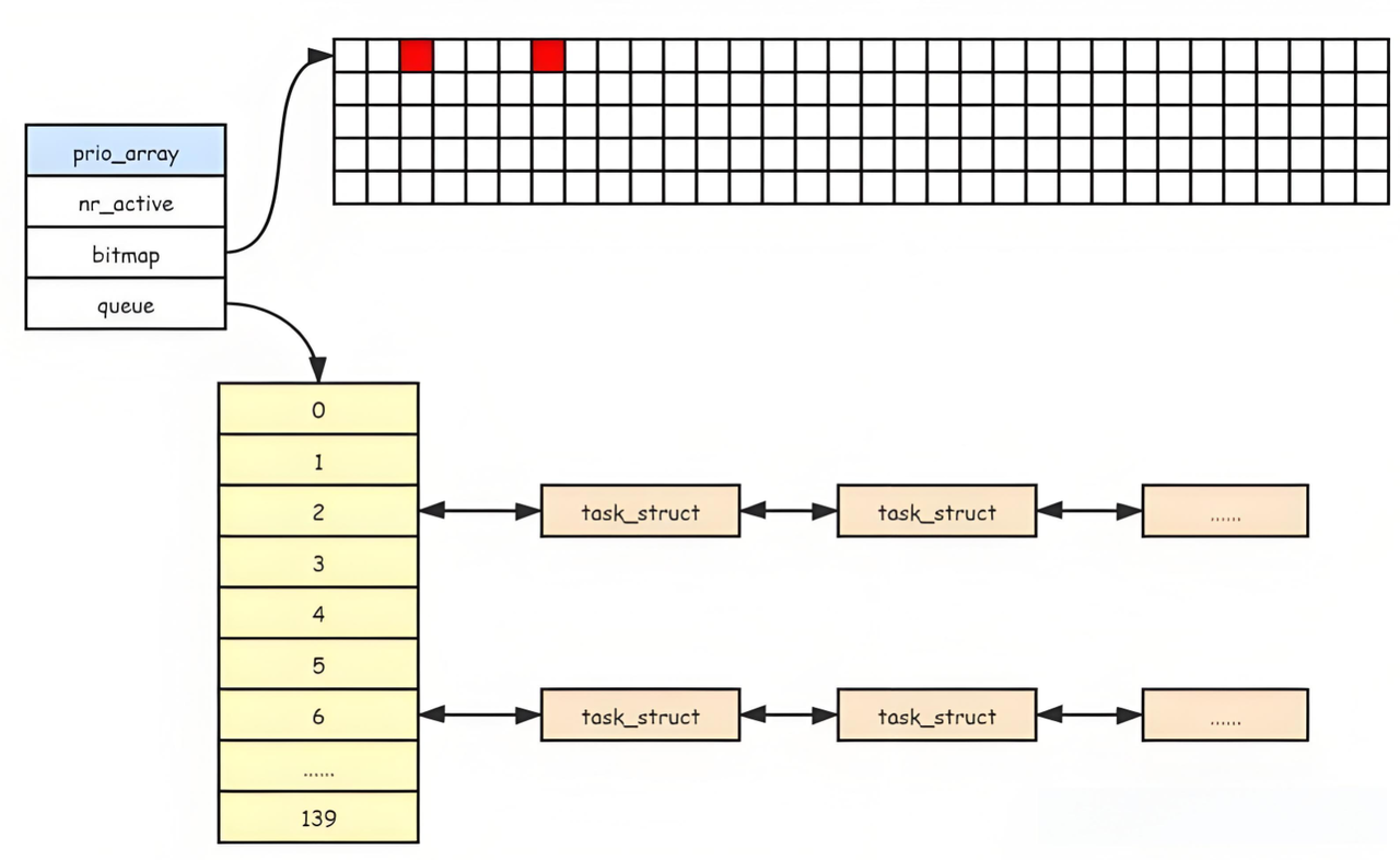 queue[140]:这是一个数组,其中每个元素对应一个优先级队列。进程按照优先级排队,相同优先级的进程使用先进先出(FIFO)规则进行调度。数组下标代表进程的优先级,因此queue[0]表示优先级最高的进程队列,queue[139]表示优先级最低的进程队列。