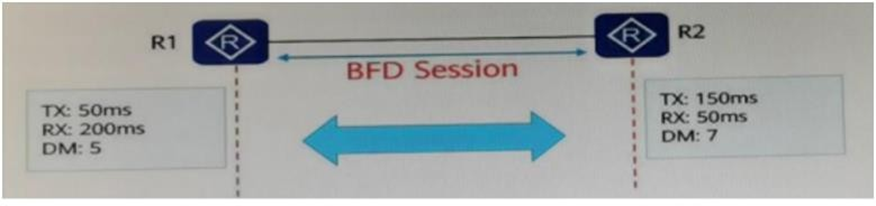 22.如图所示,R1 和R2 已配置本端发送时间间隔、本端接收时间间隔及本端BFD 检测倍数,以下关于 R1 协商后时间参数的描述,正确的是哪些项?