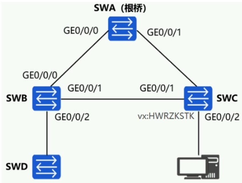 4.如图所示组网。SWA、SWB、SWC、SWD、运行 RSTP,则以下描述中正确的有哪些选项?