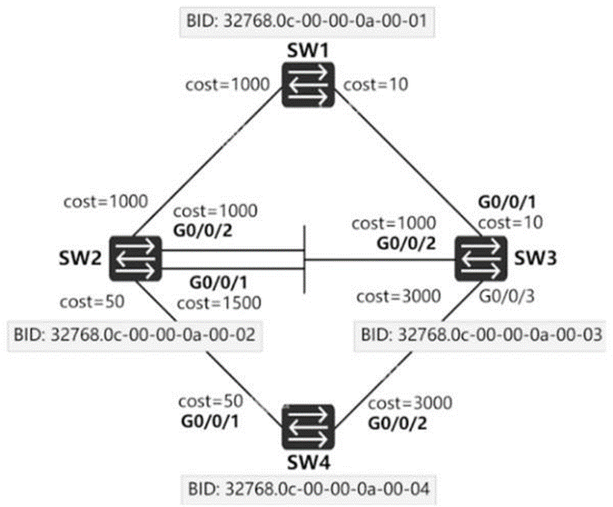 28.如图所示,四台交换机已运行并计算收敛完生成树,现将 SW3 口的所有端口开销设为 20000,那么以下描述正确是哪些项?