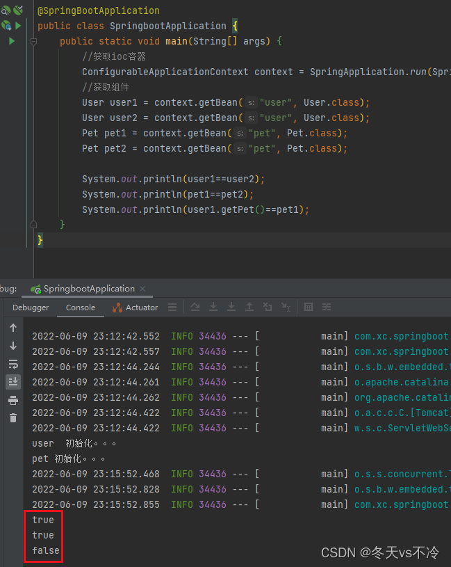 所以,如果配置类中的@Bean标识的方法之间不存在依赖调用的话,可以设置为false,可以避免拦截方法进行代理操作,也是提升性能的一种优化。但是需要注意,@Bean标识的返回值对象还是会放入到容器中的,从容器中获取bean还是可以是单例的,会走生命周期。